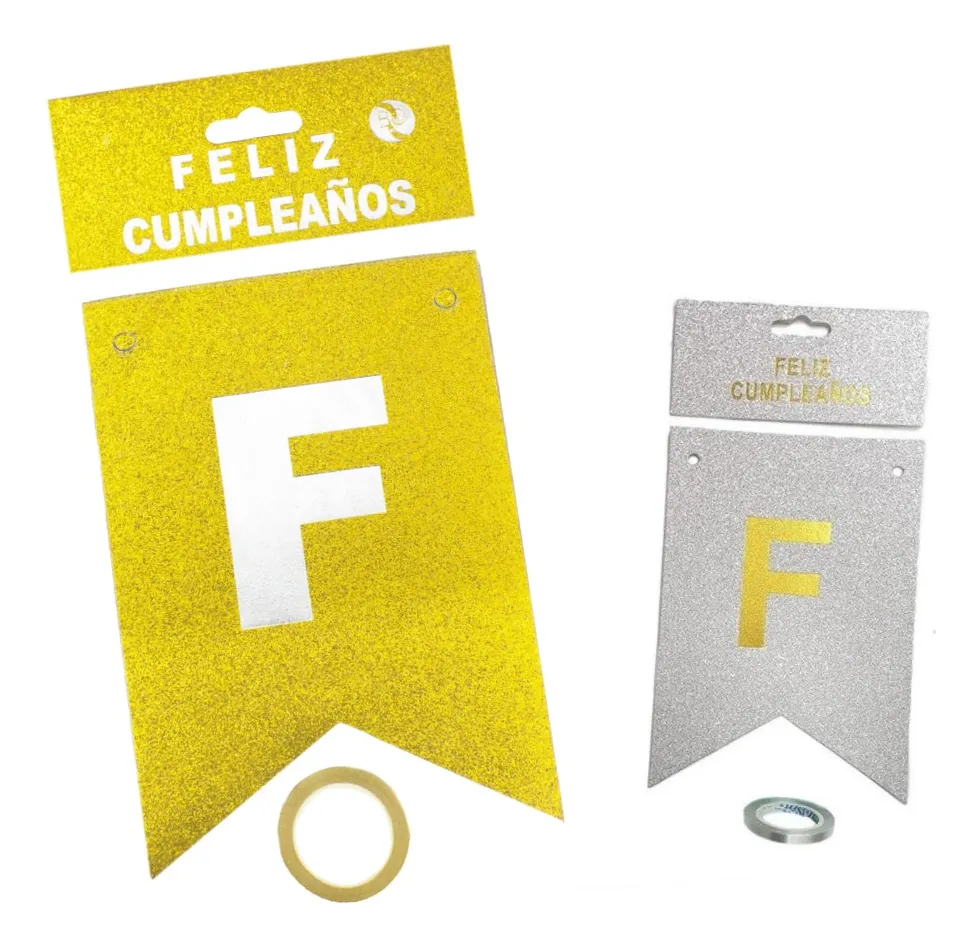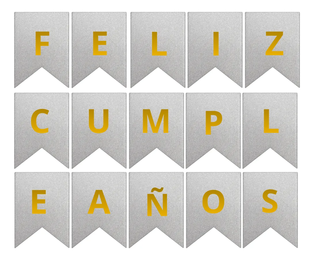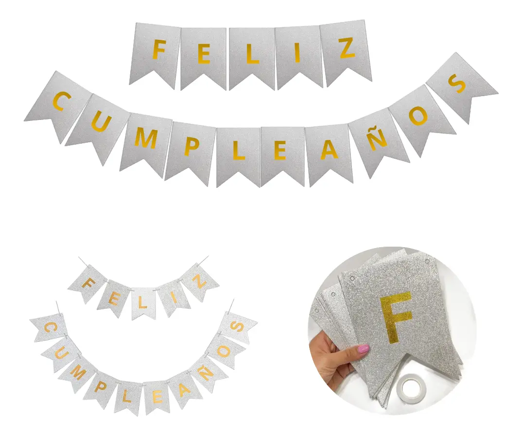 Banderin feliz cumpleaños con glitter en plata o dorado con letras doradas.