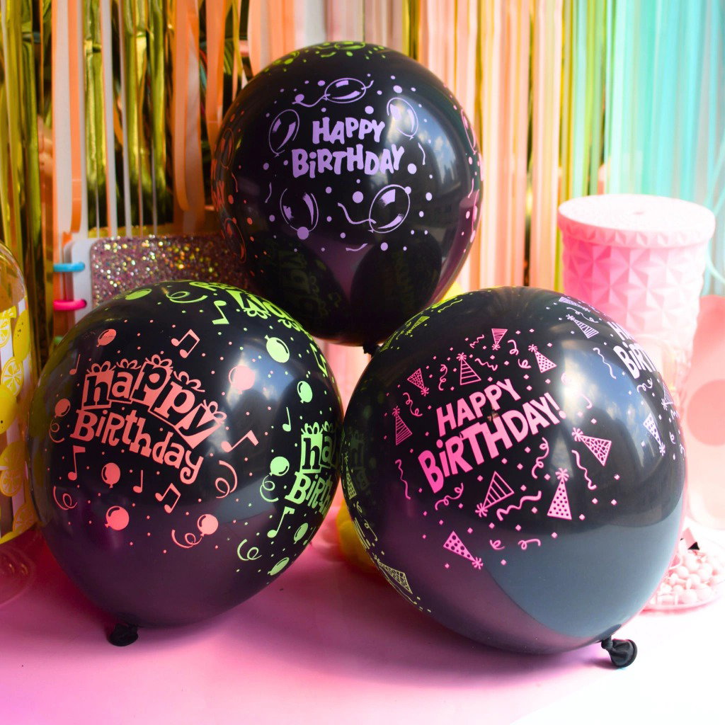 Pack ideal LISTO PARA COLGAR : 3 globos flúo estampados, aptos para helio y aire. Presentación colgable, lista para exhibir .