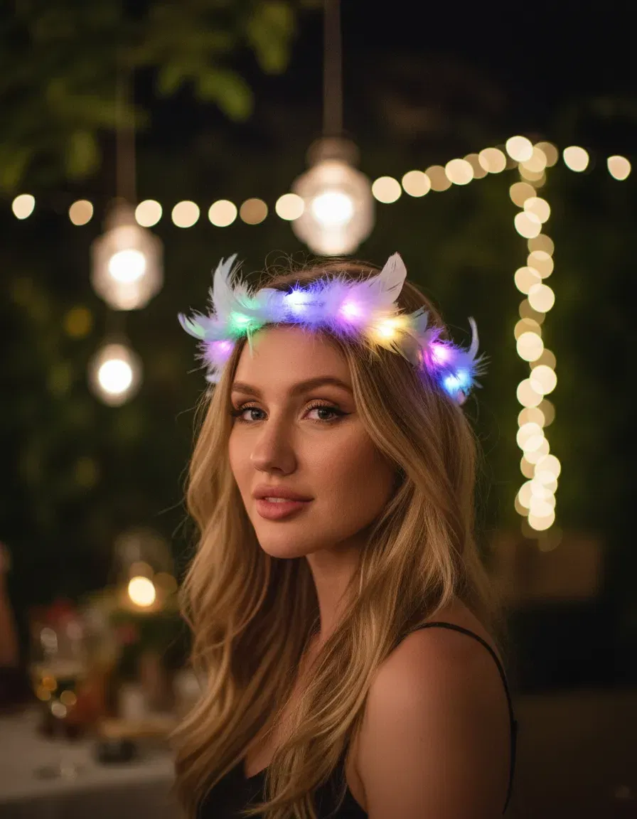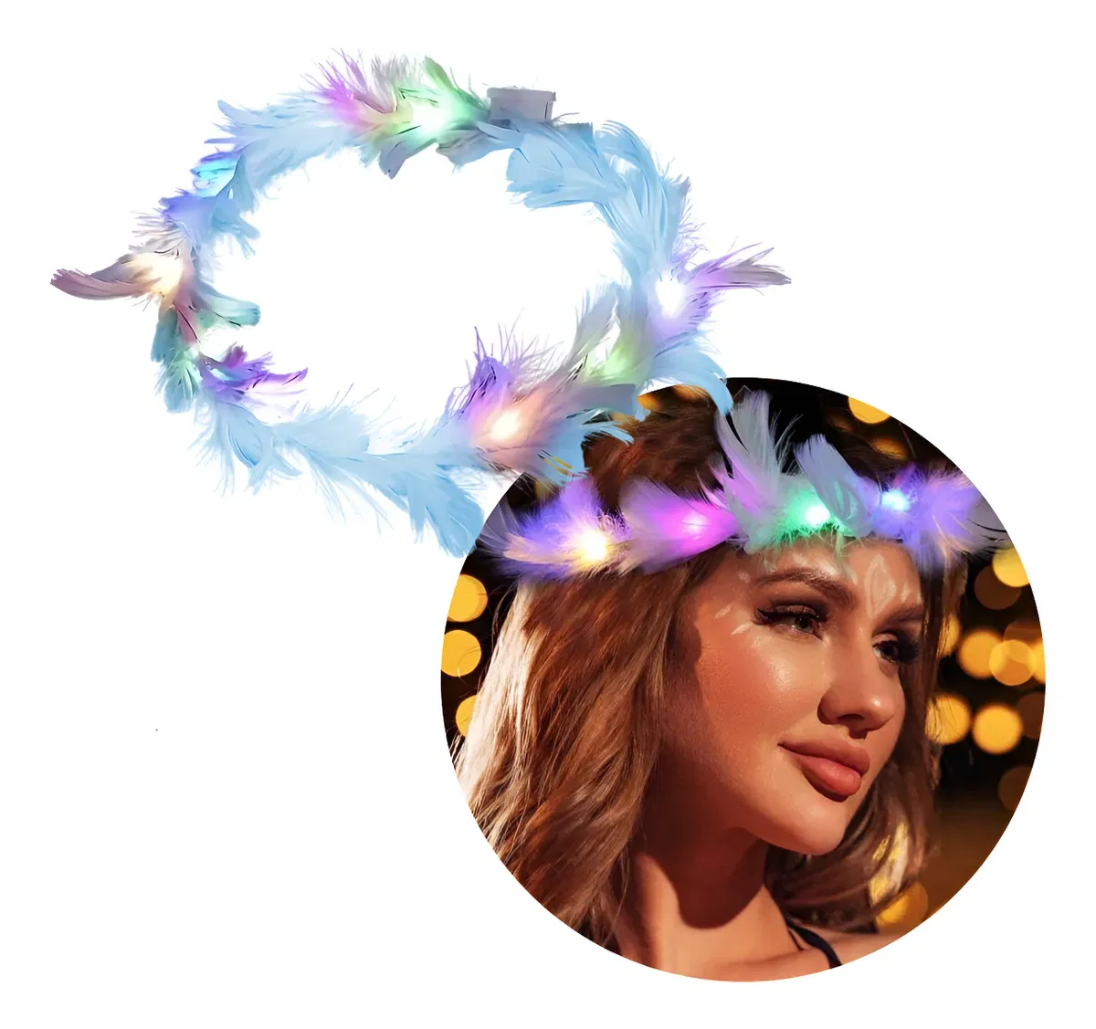 » ESPECIFICACIONES • Material: - Cuerpo de tira de alambre. Lo hace moldeable para adaptarse a cualquier cabeza. - Recubierto por plumas simil marambú. Estas son suaves al tacto y muy delicadas. • Tipo de luz: LED. Tira de led multicolor, con tres secuencias de luz. - Caja con botón ON/OFF. El mismo también funciona como selector de secuencias de luz. - Pilas incluidas. Con una duración de más de 12 horas. » Modo de uso (Es muy sencillo, pero te recomendamos mirar en imágenes). - Doblá hacia arriba los extremos y enganchalos. - Quitá el papel que separa las pilas. - Presioná el botón para elegir la secuencia de luz.