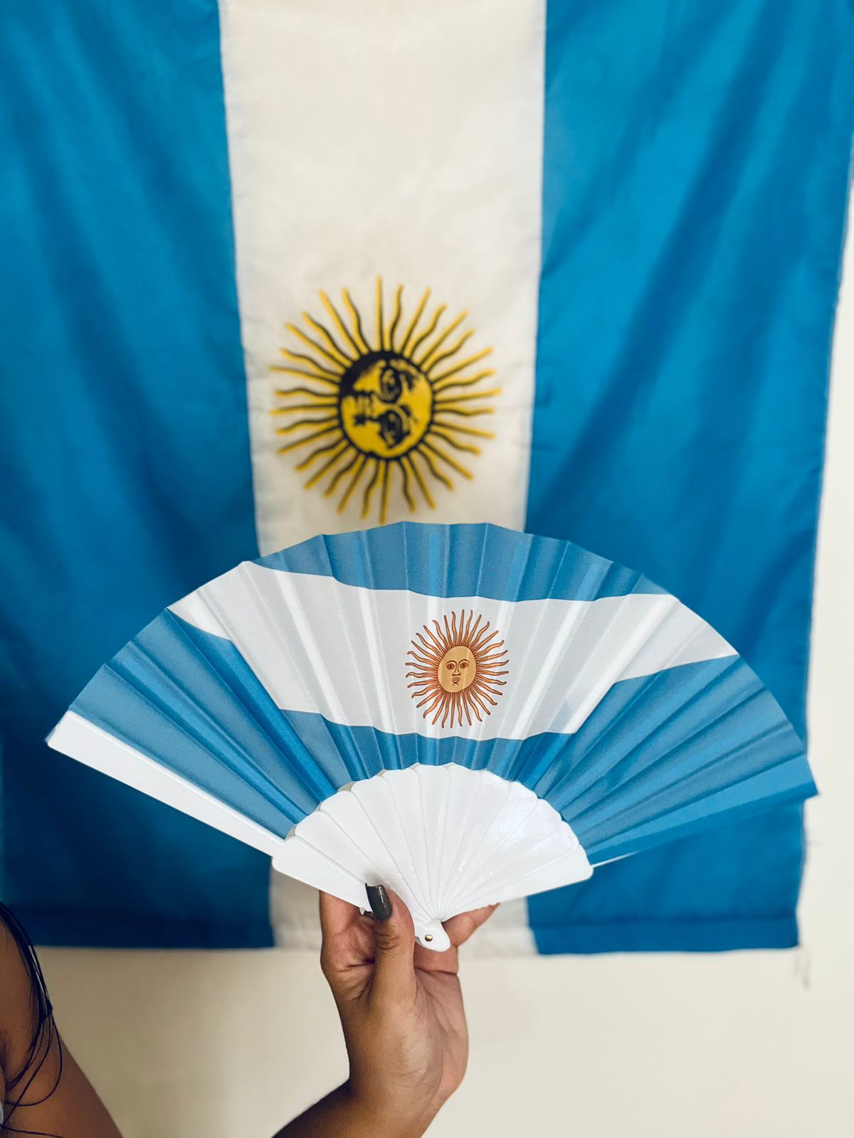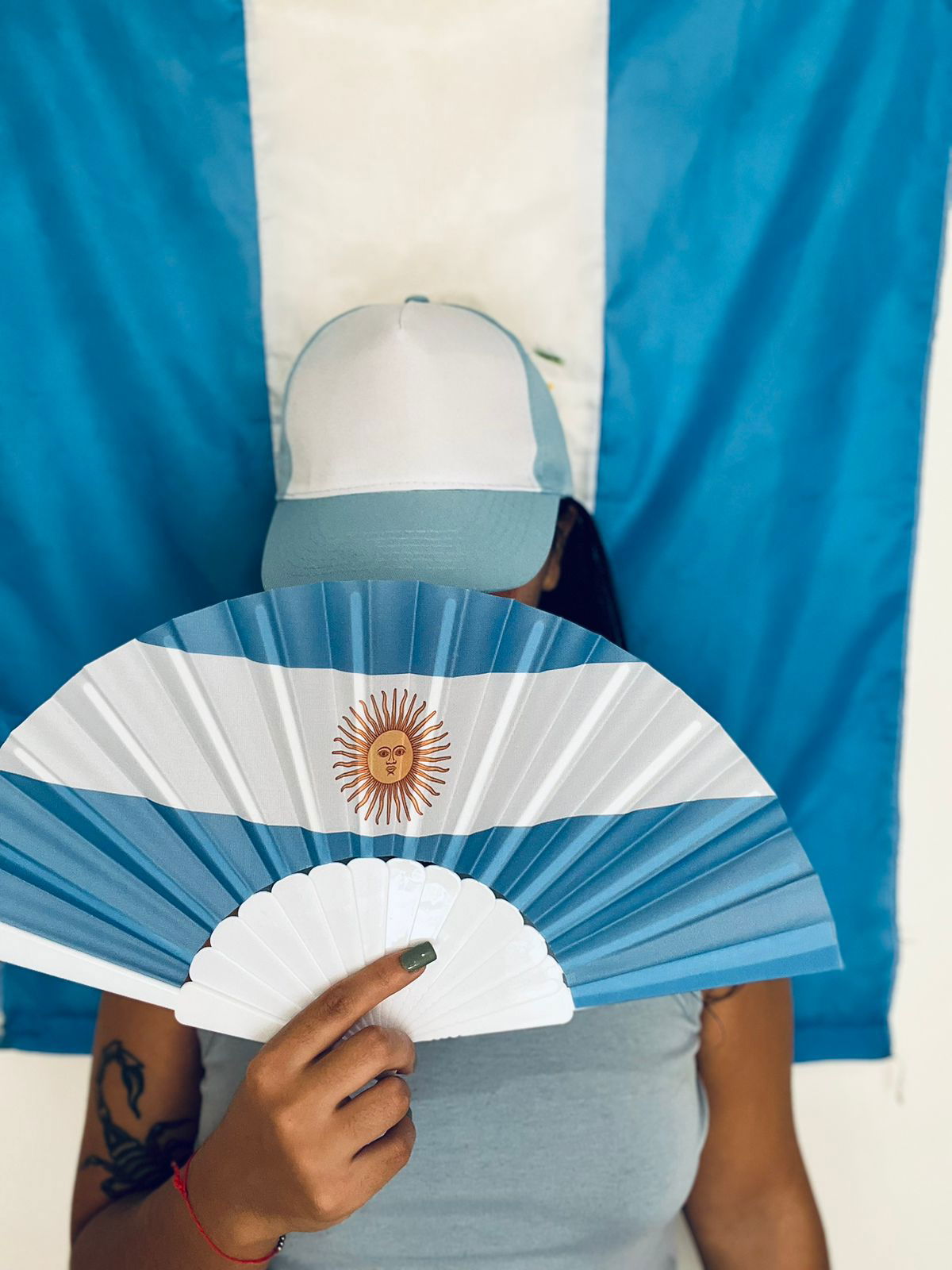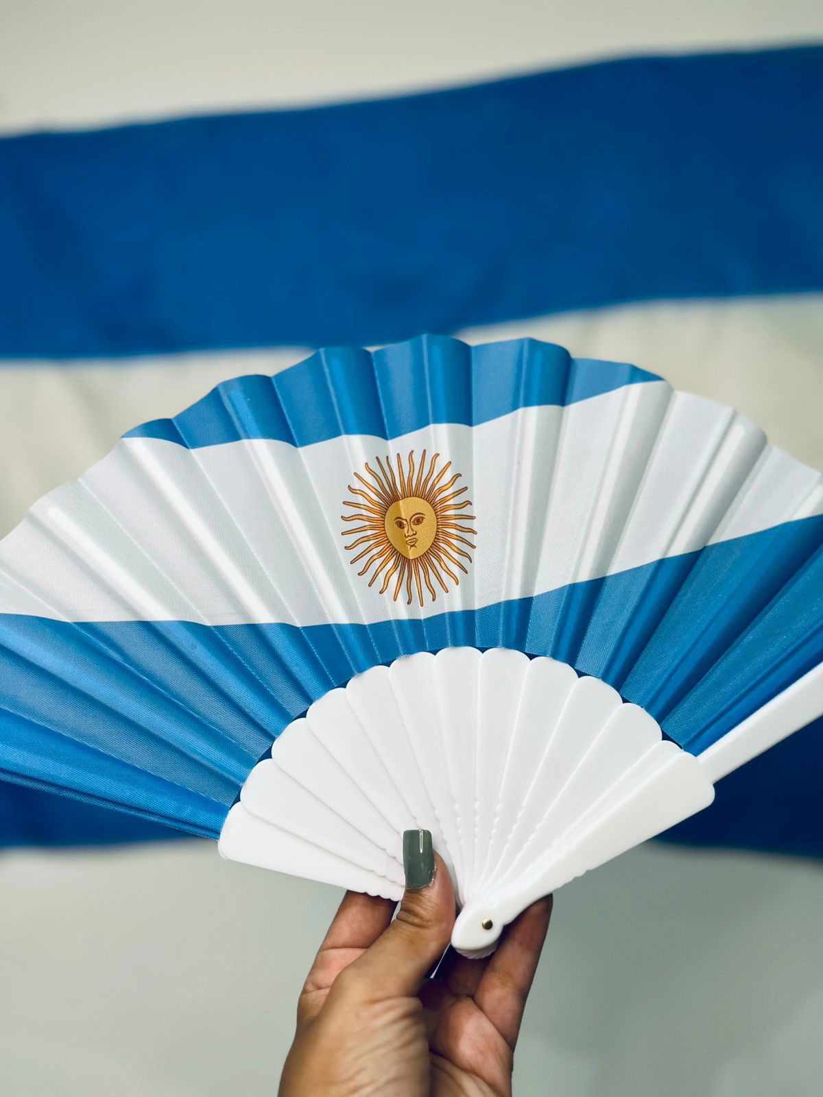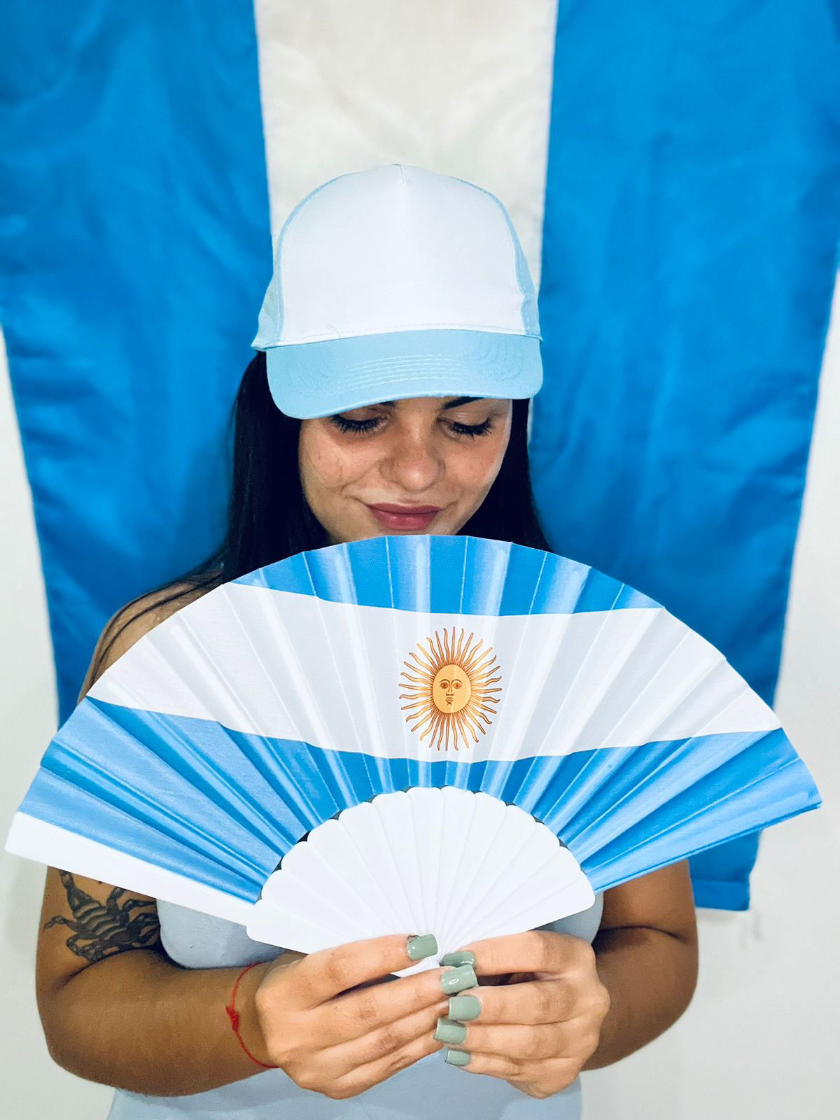 Abanico con diseño de la bandera Argentina, ideal para alentar a la Selección en modo mundialista, fiestas patrias y eventos deportivos. Fabricado con varillas de madera y papel resistente, es liviano, plegable y fácil de transportar. Perfecto para usar en la cancha, fan fest, reuniones con amigos, celebraciones y como cotillón temático. Además de refrescar, suma color y pasión argentina a cualquier ocasión. Reutilizable y práctico, es una excelente opción para regalar o para usar en eventos masivos. Diseño celeste y blanco con Sol de Mayo.