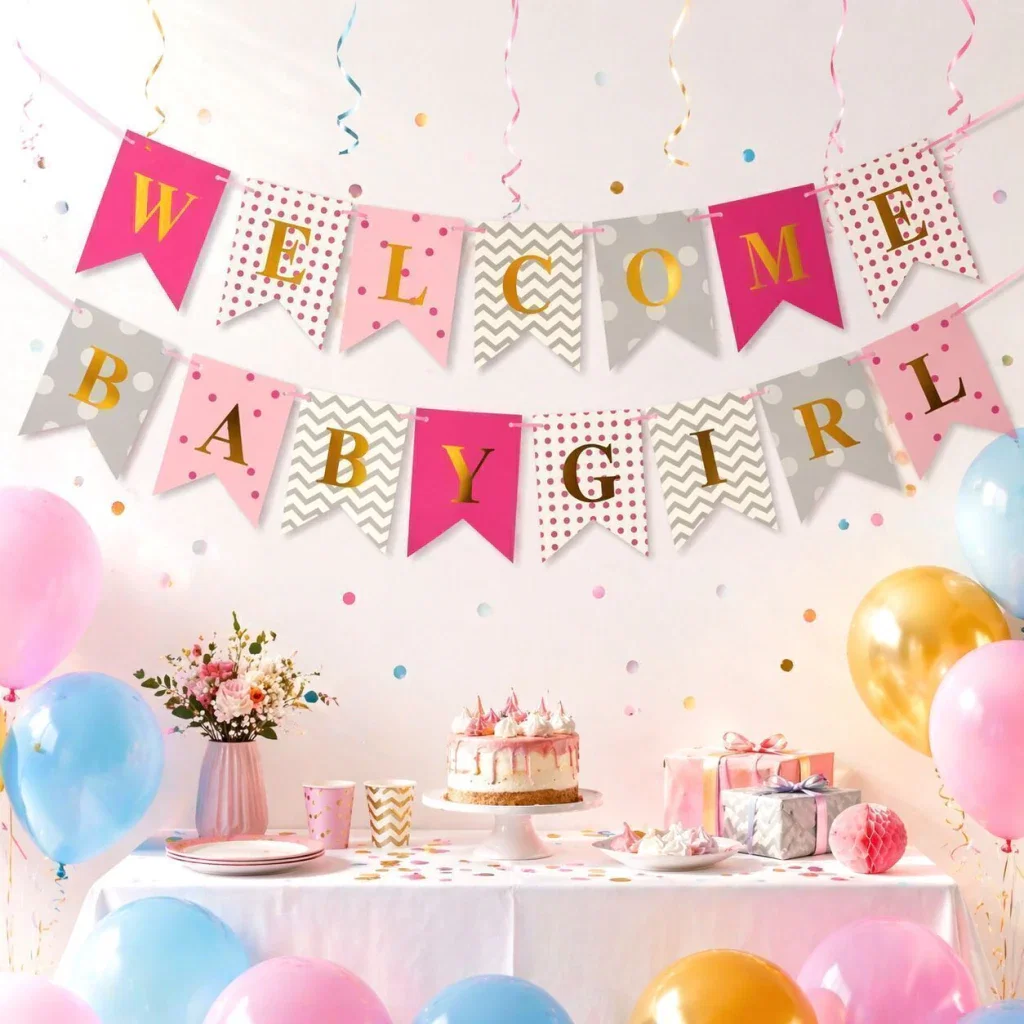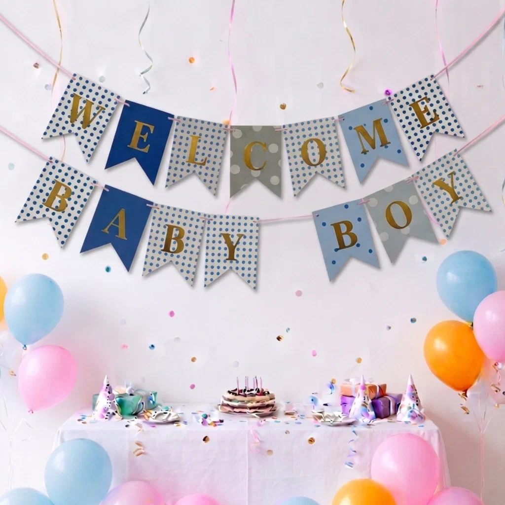 Banderín de papel, medidas: 12x17 cm, incluye cinta ribbon para fácil aplicación ideal decoración para baby showers y nacimientos.