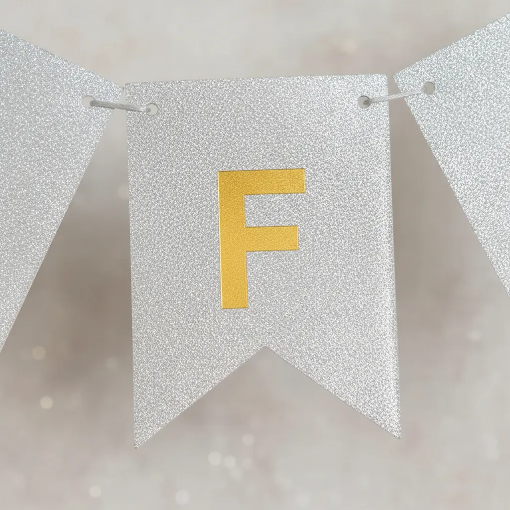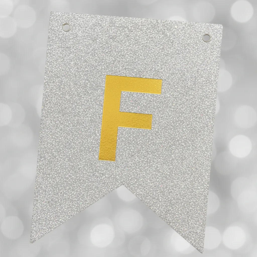 Banderin feliz cumpleaños con glitter en plata o dorado con letras doradas.