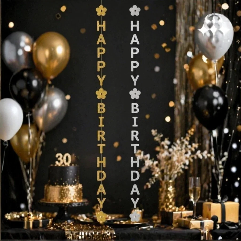 Guirnalda con letras de 7 cm y cinta de 2,5 m para colgar. Diseño atractivo con glitter, ideal para revendedores y cotillón. Producto destacado para eventos y cumpleaños.