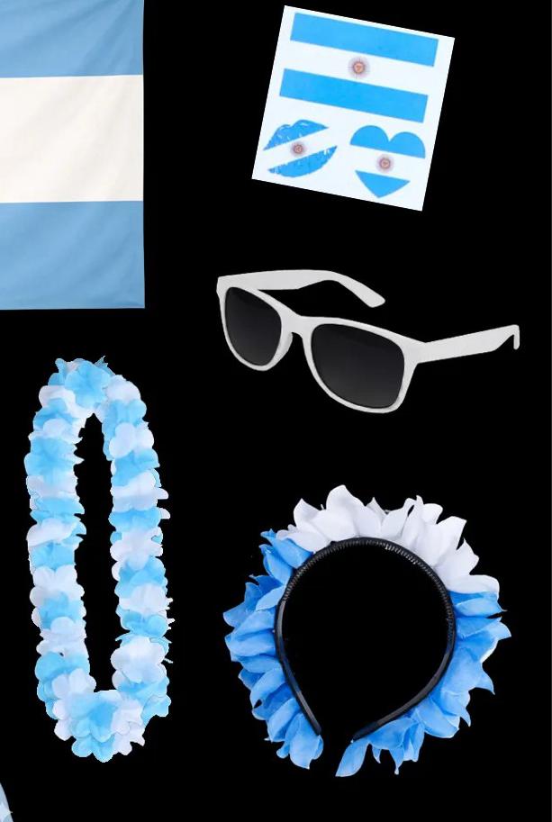 El kit contiene: 1 vincha de flores . 1 collar hawaiiano . 1 lentes de sol marco blanco . 1 plancha de tatuajes.1 CORNETA ARGENTINA