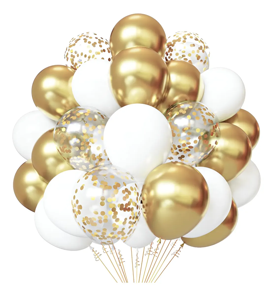 30 globos de latex dorados, blancos y con confetti 12''10 piezas de globos confetti 20 piezas de globos dorados y blancos metalizadosCintitas